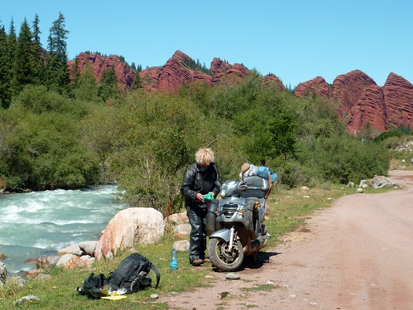 Fur alle Alpinisten, die sich mehr für Steine statt für Bräute interessieren: Die roten Berge im Hintergrund sind die Dzeti Oguz Felsen in Kirgisien, unweit vom Issy Kül See. Womit ich ganz nebenbei dieses wunderbare, schöne, gastfreundliche Land allen Wanderern, Reitern, Naturliebhabern, Bergsteigern, Abenteurern, Neugierigen und Weltenbummlern ans Herz legen möchte.